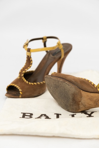 Pre-Owned BALLY Tbar Suede Leather Heels. Suede outer with patent leather yellow whipstitch and strap. Made in Italy. With original BALLY dustbag