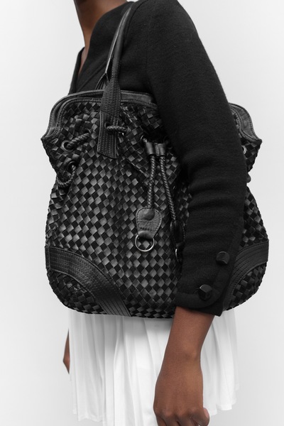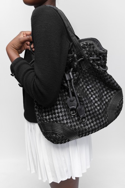 Vintage Bottega Veneta woven leather tote bag. Drawstring fastening. Two top handles. Roomie size. Inner has two large compartments, and smaller ones. Made in Italy. *Priced according to its condition