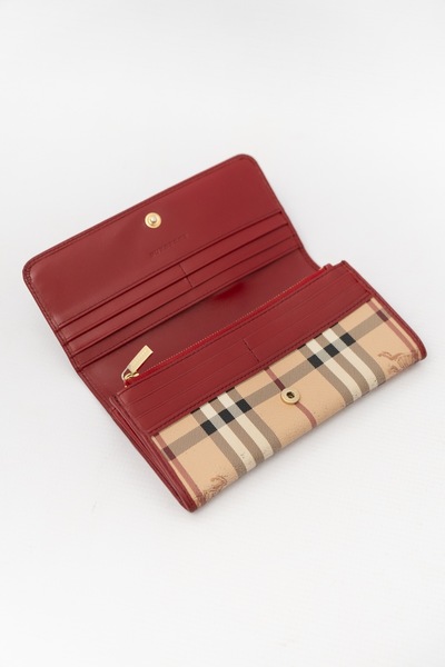 Pre-Owned Burberry Beige and Red Nova Check Long Wallet. Nova Check Burberry canvas with red cherry leather inner and trims. Many slots and compartments for coins and cash. Made in China. With original dustbag