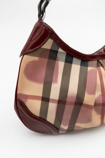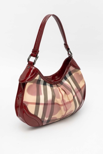 Pre-Owned BURBERRY Pre-Owned Nova Check Heart Half Moon Shoulder Bag. Small zip up pocket. Patent Leather. Beige/cream nova check canvas. Comfortable shoulder strap. Cute and stylish! Made in Italy. Supplied with MOY dustbag. Retail pre-owned starts at R6900