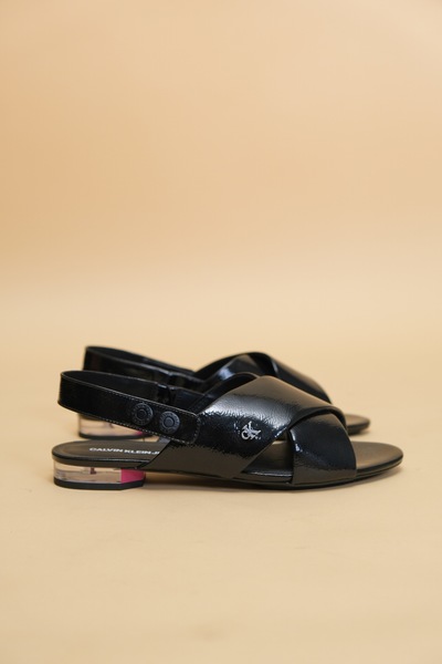 Calvin Klein Jeans Criss Cross Patent Sandals. Silver tone CK logo on the side. With a box and tags.