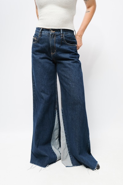 Calvin Klein Extreme Wide Leg High Rise Denim Jeans in Dark Stone. Extra long. Leather Calvin Klein tag at the back. Engraved CK silver button. Zip up.