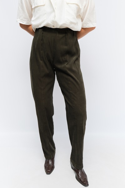 Vintage South Africa designer Clive Rundle high rise pants in olive green. A very flattering high rise fit. Elasticated waist. Zips at the back. Soft suede like fabric.