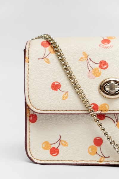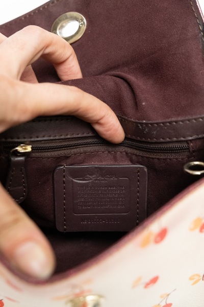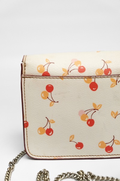 Pre-Owned Coach Cherry Print Crossbody Bag. Engraved Coach turn lock. Flap closure style. Cherry Print Monogram Coach canvas. Enagrevd Coach New York hardware. Burgundy genuine side lining inner. Small enough for all of your essentials. Cross body chain