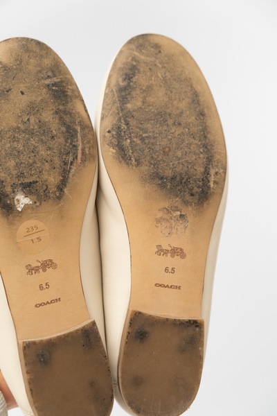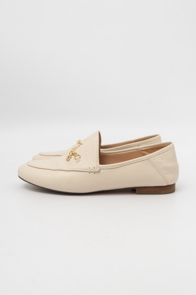Pre-Owned COACH Hanna Chain Strap Leather Loafers. Cream chalk leather with gold tone chain and C-logo charm embelishment. With original Coach dustbag