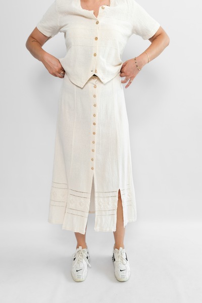 Vintage ecological cotton handmade skirt set. 100% cotton. Vest and hog waisted skirt with slits. Skirt has an elasticated waist. 100% ecologically sourced cotton