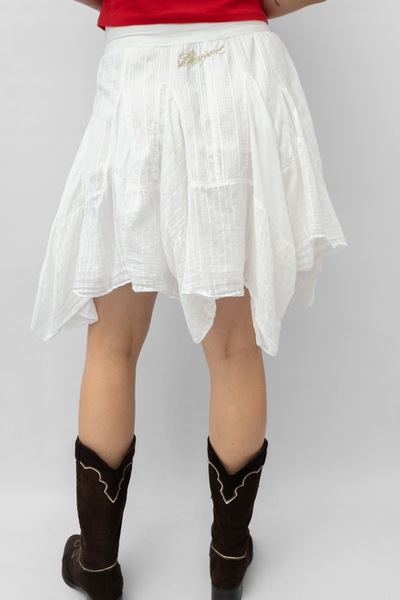Pre-owned Desigual Cotton Embroidered Skirt. High waisted waterfall skirt. Embroidered patterns, mother of pearl button details on the waist band. Side zip. Knee length. Desigual embroidered logo on the waistband.