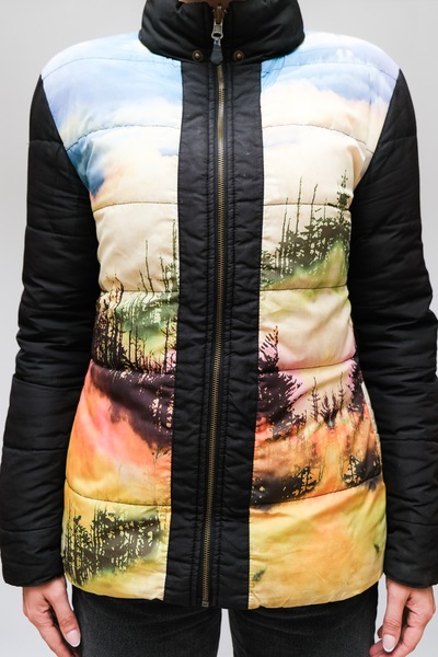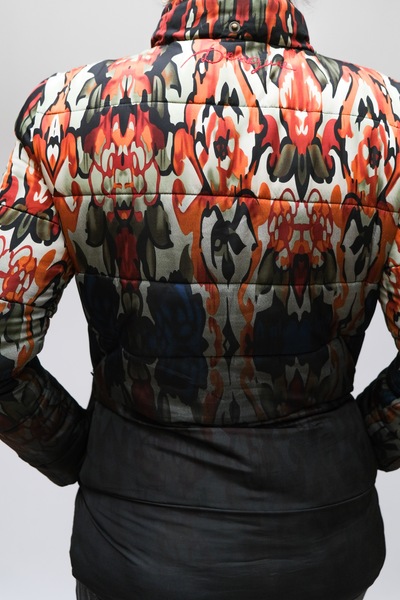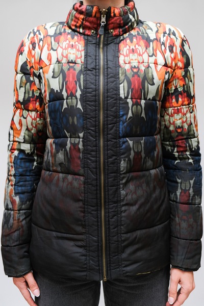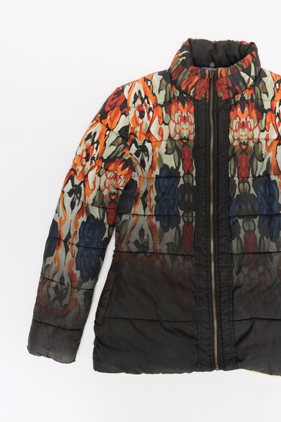 Pre-owned Desigual Reversible Puffer. A unique eye catching puffer jacket. Watercolor forest motif side & camp side. Embroidered Desigual logo.