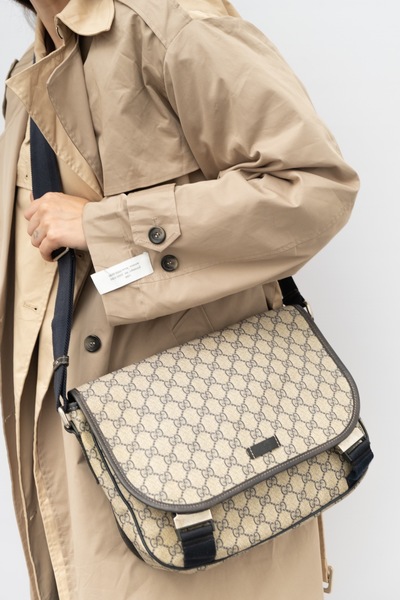 Pre-owned GUCCI GG Supreme Canvas Messenger Bag with navy leather trims and navy canvas shoulder strap. Flap silhoutte. Embossed Gucci silver buckles. Canvas inner. Fits a laptop or can work as a diaper bag. Adjustable canvas shoudler or cross body strap. Made in Italy. Supplied with MOY dustbag. Retail pre-loved starts at EUR1054 / ZAR 20 900