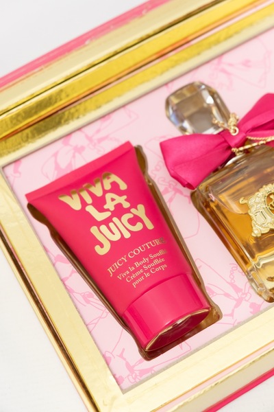 Juicy Couture Perfume Set. 100ML Viva La Juicy perfume spray, 10ml tester perfume spray, Viva la Body souffle. Perfect gift set for a Juicy lover!