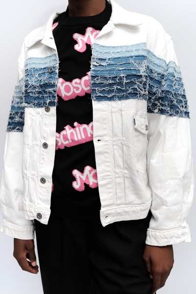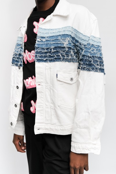Levis Made&Crafted Blue Tab Denim Jacket in white. Inspired by the emblematic Levi’s Type II, this Levi's® Made & Crafted Trucker Jacket features distinctive details on the french seam, an oversized fit and a striking design with ombré fringed stripes. Pure craft. Sold Out Online. Est Retail R2800
