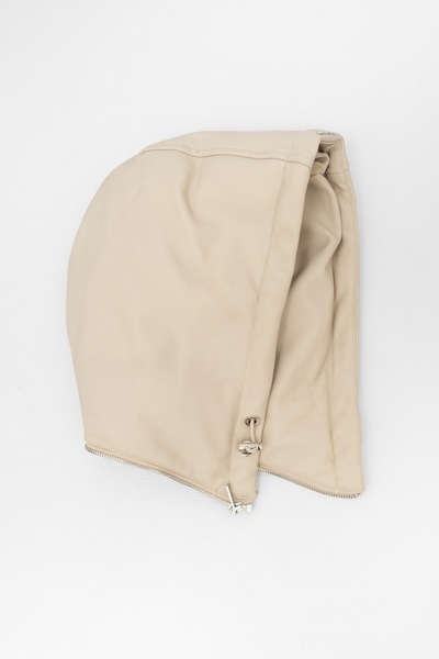 Pre-owned MANIERE DE VOIRE PUFFER in cream. Ribbed effect faux leather. Detachable hood. Retail R4800 + tax