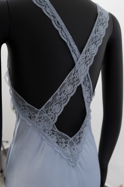 Pre-Owned Rumored Satin Lace Maxi Dress. Ligth blue color. Lace trim neckline. Silky satin fabric. Floor length. Retail R3075 + tax. Gorgeous!!!