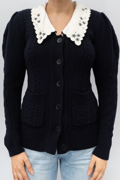 Pre-owned SANDRO Crepe De Chine Trimmed Cable Knit Wool Cardigan. Features contrasting embroidered collar. Button up style. Thick cable knit style wool. Emboridered collar is detachable.